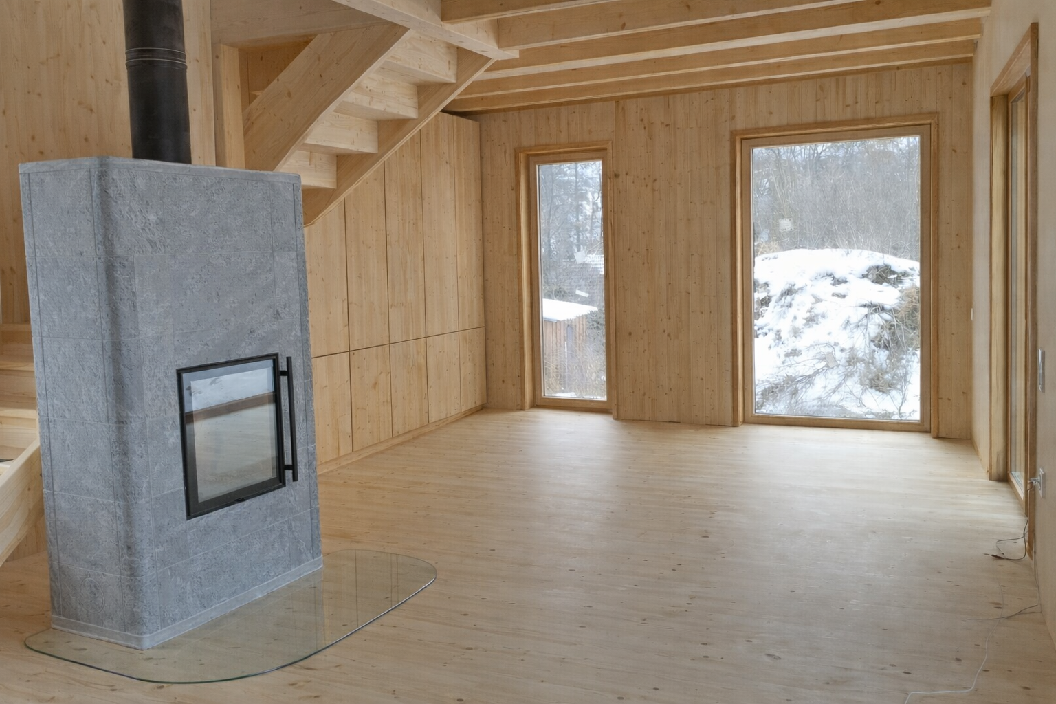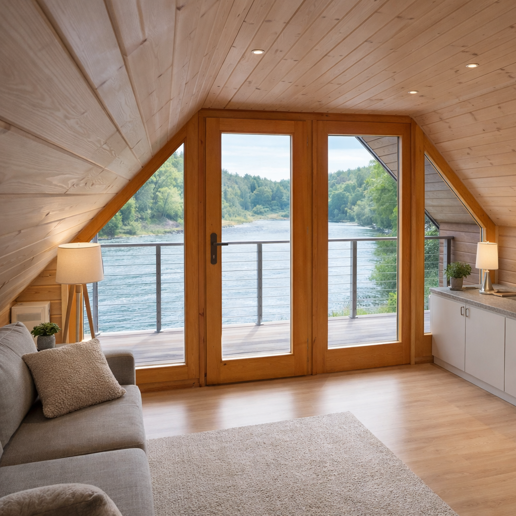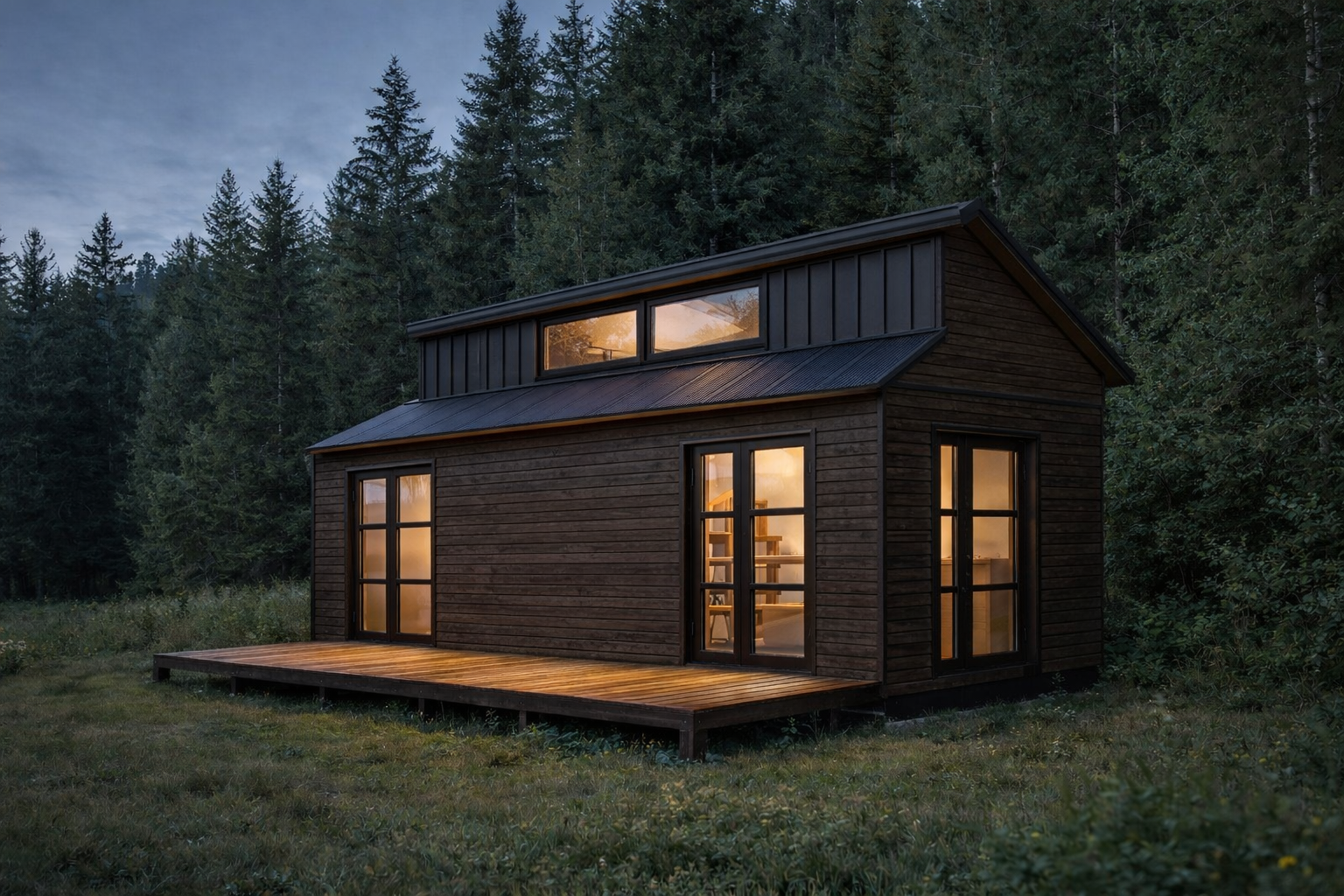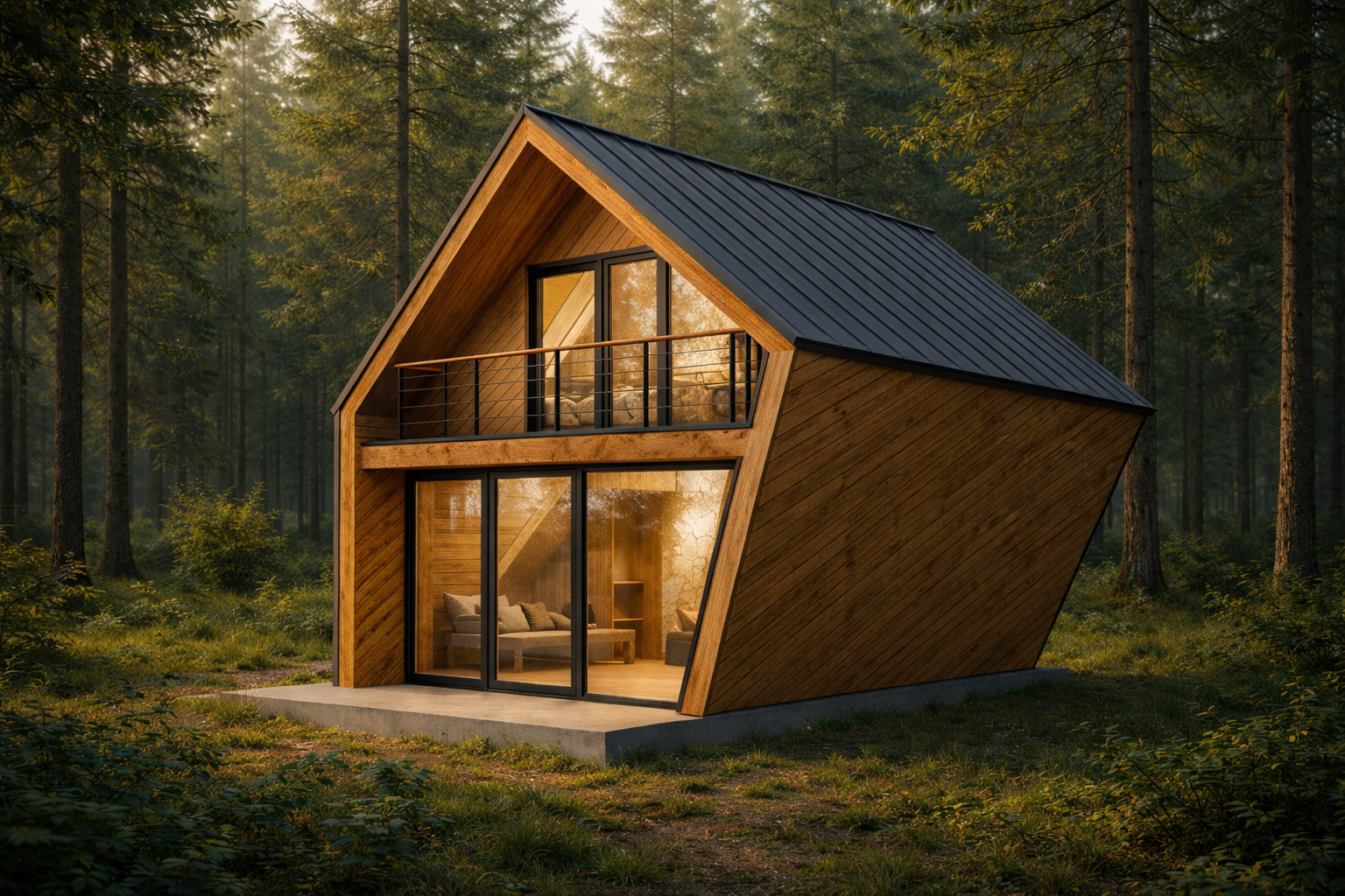 Malá dřevostavba chaty BEnešov do 25m2 zastavěné plochy s částečným patrem pro spaní.